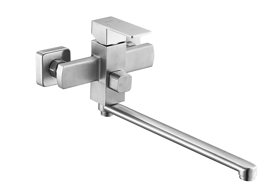 Cм-ль для ванной, техналогия производства токарная обработка, материал корпуса нерж. cталь SUS 304 (пищевая), с пов. плоским изливом 360°, картридж ø35, без покрытия, встр. в корпус картриджное переключение на душ
