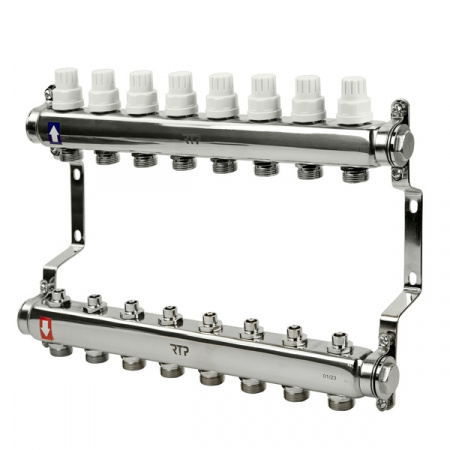 RTP 1″х3/4″ЕК 8 выходов Коллекторная группа с ручными регулирующими клапанами и кронштейном, нержавеющая сталь, РТП
