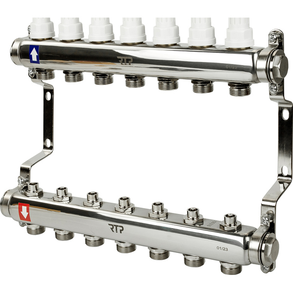 RTP 1″х3/4″ЕК 7 выходов Коллекторная группа с ручными регулирующими клапанами и кронштейном, нержавеющая сталь, РТП