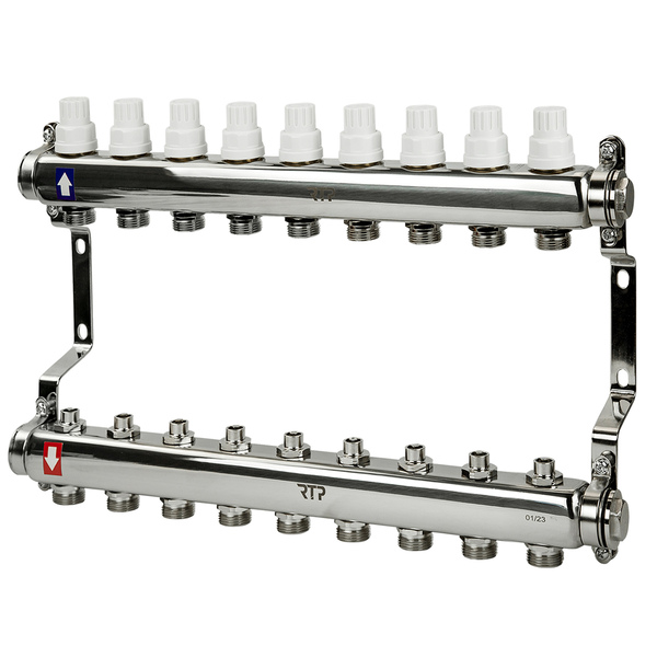 RTP 1″х3/4″ЕК 9 выходов Коллекторная группа с ручными регулирующими клапанами и кронштейном, нержавеющая сталь, РТП