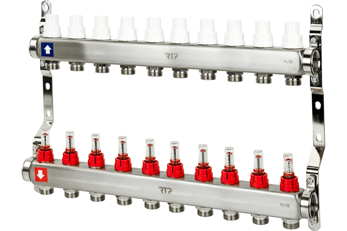 Коллекторный блок объединяет в себе подающий и обратный коллекторы из нержавеющей стали, ручные настроечные клапаны c расходомерами, регулирующие клапаны (с возможностью установки электротермического сервопривода), автоматические воздухоотводчики, дренажные клапаны и крепежные кронштейны.