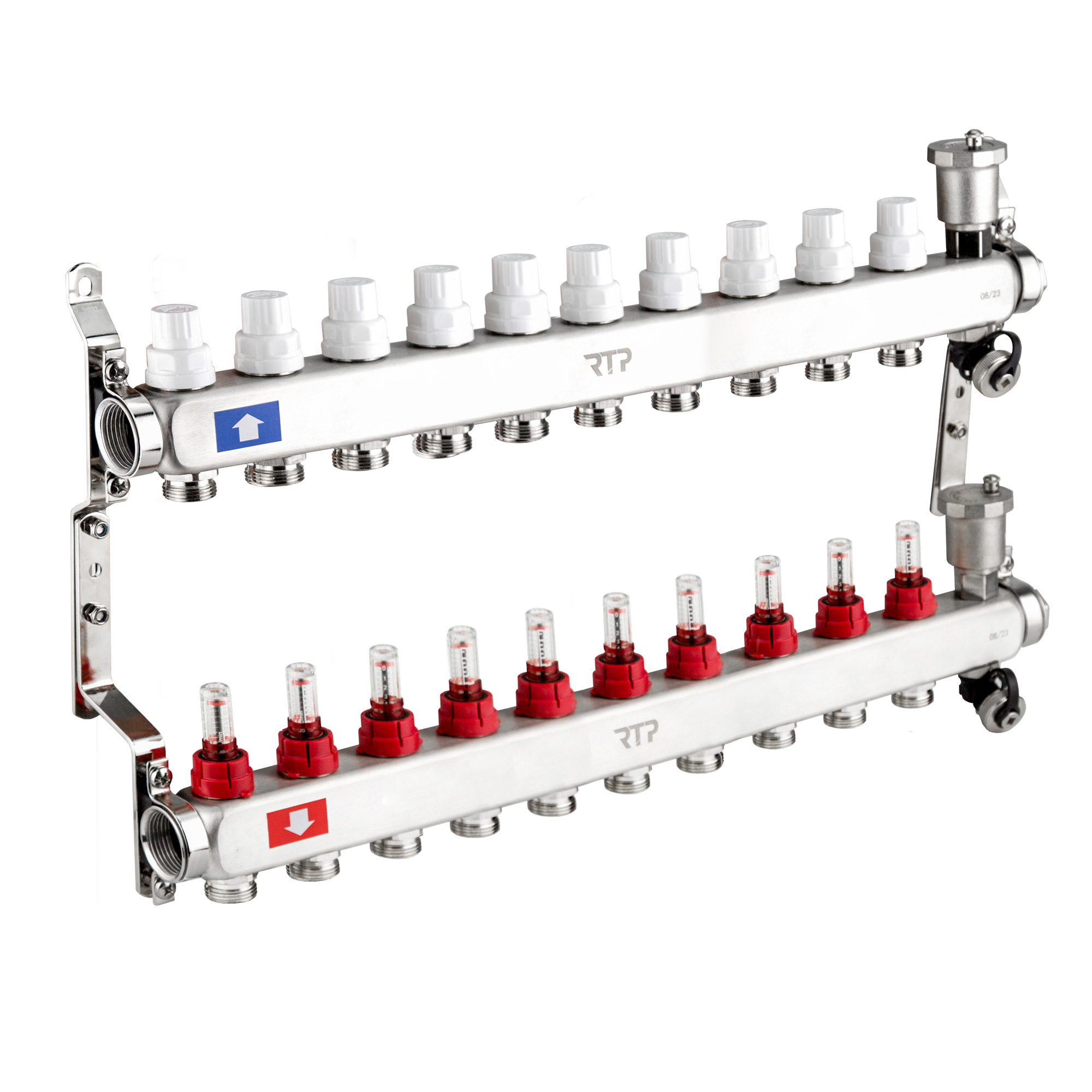 Коллекторный блок объединяет в себе подающий и обратный коллекторы из нержавеющей стали, ручные настроечные клапаны c расходомерами, регулирующие клапаны (с возможностью установки электротермического сервопривода), автоматические воздухоотводчики, дренажные клапаны и крепежные кронштейны.