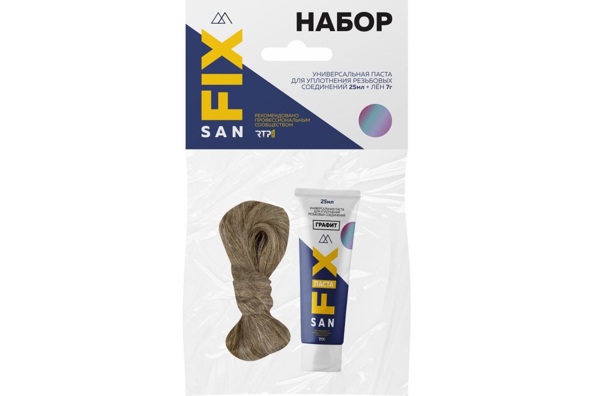 Уплотнительная паста – высоковязкое вещество графитового цвета. Сантехнический лен – натуральное льняное волокно, однородный, очищенный, чесаный материал. Паста универсальная уплотнительная SANFIX используется вместе со льном с целью уплотнения резьбовых соединений на трубопроводах различного назначения, включая системы водоснабжения, отопления. Нанесенный на трубы лен, пропитанный пастой, не меняет качество перемещаемой по трубопроводу рабочей среды, выполненное соединение стойко переносит вибрации.