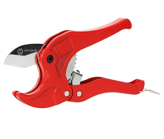 Ножницы MVI предназначены для ручного разрезания под прямым углом, металлополимерных (металлопластиковых) и пластиковых труб диаметром до 42 мм. В закрытом положении ножницы фиксируются ограничителем. Два полукорпуса ножниц соединены заклепками. Нож с подпружиненным механизмом закреплен по центру винтом. В нижней части рукоятки находится ограничитель, удерживающий ножницы закрытыми в нерабочем режиме.