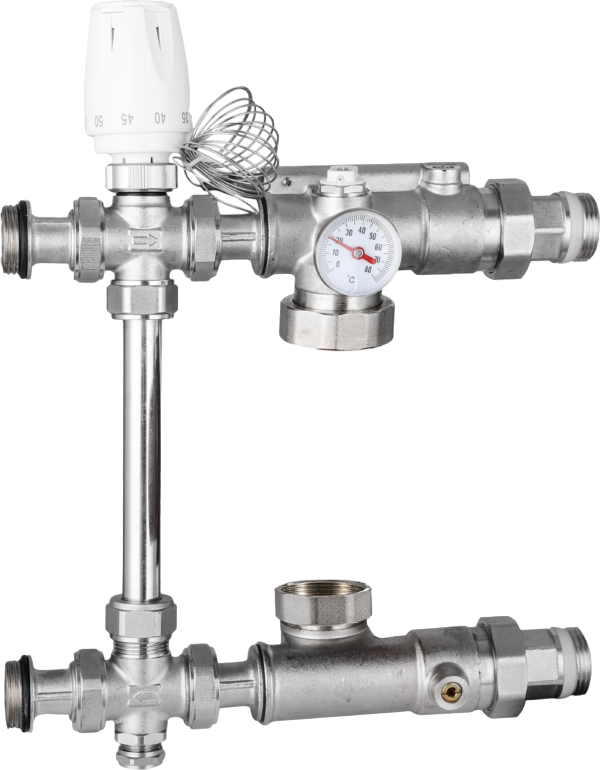 Насосно-смесительный узел с боковым подводом, материал корпуса латунь (CW617N) с никелированием, диаметр подключения подающей линии 1“ НР, диаметр подключения обратной линии 1“ НР, диаметр подключения к коллектору 1“ НР с антипротечкой, монтажная длина насоса 130 мм (крепёж с регулировкой), диапазон регулировки во вторичном контуре от 30 до 70 °C, максимальное рабочее давление 10 бар, максимальная рабочая температура 90 °С, размер гаек циркуляционного насоса 1″1/2″, резьба подключения термоголовки с погружным датчиком М30 × 1,5